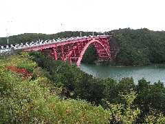 海沿いの道が、いきなり山道に変わり、あちこちで紅葉に色づく山並みの頂きまで、タクシーは元気よく駆け上がった。白亜のリゾートホテルにぶつかる。そして狭まった伊雑ノ浦をまたぐようにして架けられた赤い橋が、展望台付きでこちらを招いている。タクシーを停めて、眺望をたのしめ、ということか。
