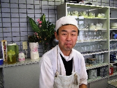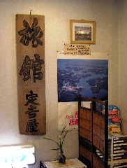 ホテルの敷地脇から真っ直ぐに下る道を、自分の庭にでも入っていく感じで抜けると、ぽっかり海ぎわに出た。目の前には、先刻、見下ろしたばかりの筏の群れが広がっている。振り向くと、そこが「丸定旅館」の玄関で、女将さんらしい女性が笑顔で出迎えてくれる。来意を告げると、海の見える、明るい食堂に通された。折から一組の客が食事を済ませたところらしく、入れ替わる感じとなって手が空いたのか、白いコック帽をかぶったこの宿の主人、西村和也さんが、わざわざ挨拶に現れたのである。
