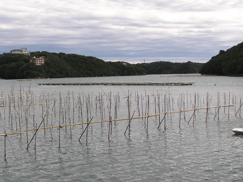 「筏のようなものが浮かんでいますやろ。あれがカキの養殖用で、竹竿のようなものが突き刺さっている方がアオサという海苔用。この伊雑ノ浦には伊勢の山々から流れ込む三本の川がたっぷり栄養を運んでくれるもんで、プランクトンがよう育つ。それをエサにするから、カキも海苔もよう育つ。まさに恵みの海ですな」