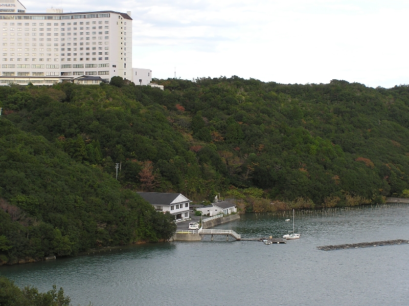 海沿いの道が、いきなり山道に変わり、あちこちで紅葉に色づく山並みの頂きまで、タクシーは元気よく駆け上がった。白亜のリゾートホテルにぶつかる。そして狭まった伊雑ノ浦をまたぐようにして架けられた赤い橋が、展望台付きでこちらを招いている。タクシーを停めて、眺望をたのしめ、ということか。