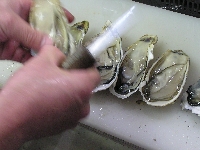 「(的矢カキは)通称〝無菌カキ″ともよばれている。特色は、成長が早いので、それだけ新鮮な香りと甘み、色、身の弾力が生かされる。身はたべごろの中粒でふっくらと丸く、つやがあり、白色か少し青みがある。ひだがよく縮み、貝柱は半透明。貝のへりが黒ずんで、全体に重い感じ」(「味国記・三重の項」より)